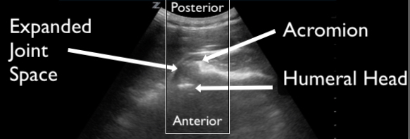 Figure 17. Demonstration of an anterior shoulder dislocation on ultrasound. The ultrasound transducer is placed on the posterior shoulder in the transverse body plane. The acromion and the humeral head are identified as labeled on the image. There is an abnormal space between the acromion and humeral head with translation of the shoulder away from the transducer, consistent with an anterior dislocation and hemarthrosis. Compare this image to the normal shoulder in Figure 7.