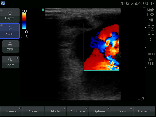 Upon placing the ultrasound probe on the patient’s forearm, he immediately realized this was not an abscess; the fluid collection didn’t look right. When color flow was placed on the large, round fluid collection, the fluid was pulsing! This was, in fact, either a pseudoaneurysm or aneurysm of the radial artery with a fistula between the cephalic vein and radial artery. In essence, the knife wound in January had poked a hole in the artery in the patient’s upper forearm and connected the artery to the nearby vein. Every time the artery pulsed, it had been pushing blood into the vein and the surrounding soft tissue. These ultrasound findings were reinforced by the fact that the patient had only a very faint pulse at his wrist near his right thumb (the distal radial artery), but a very strong pulse in his left wrist. If Alfunsi had cut open this wound, it would have bled all over the room, and the patient could even have lost his arm. Instead of antibiotics or cutting open the swelling with a scalpel, this patient needed a vascular surgeon to repair the artery and vein.